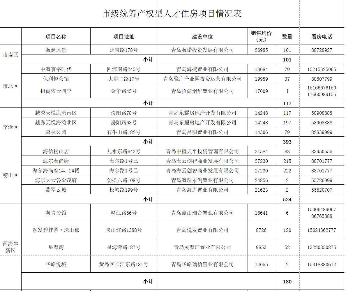 原标题:青岛发布在售产权型人才住房项目最新情况表,包括23个项目、1966套房源